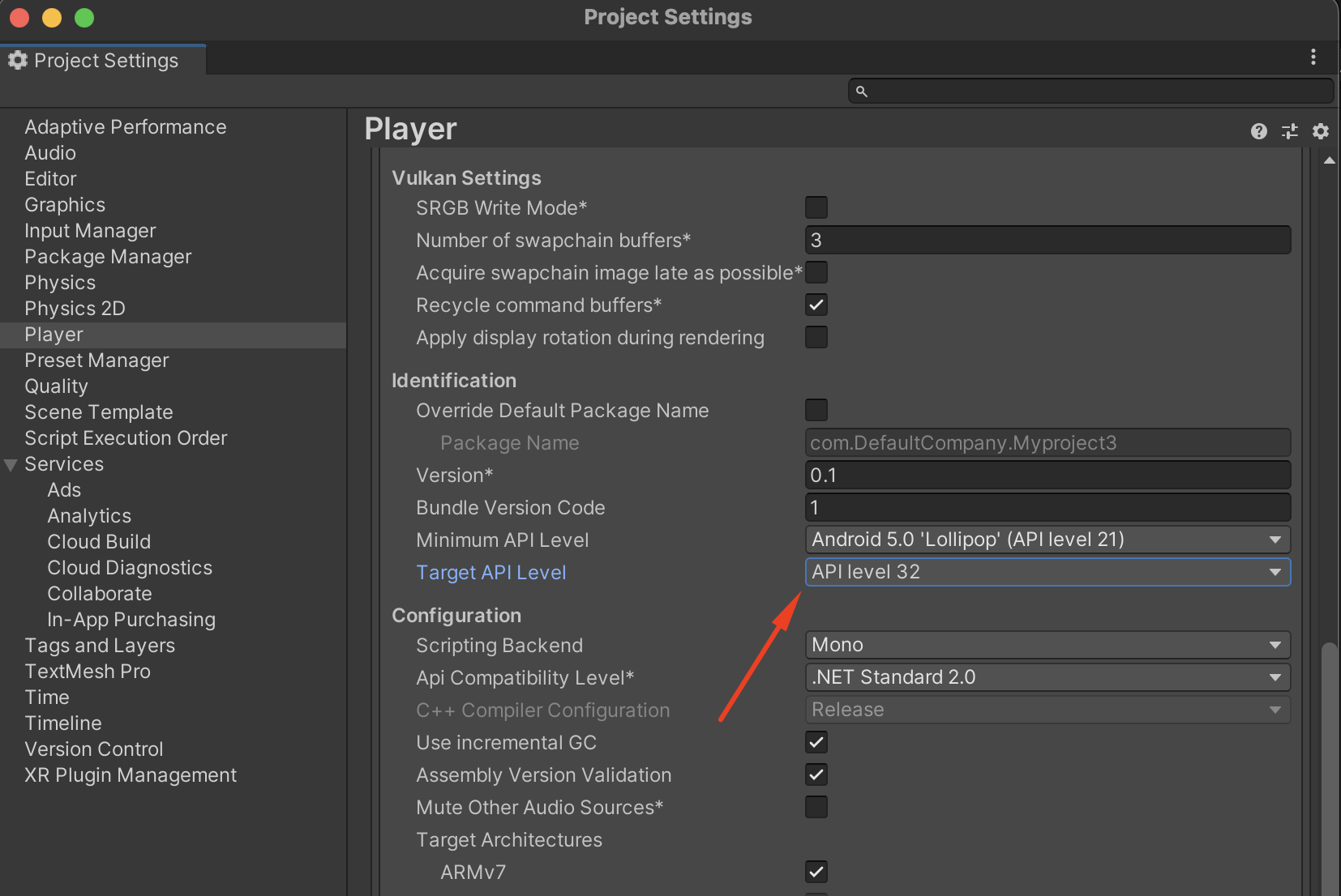Установите Target API level 32 по пути File → Build Settings → Player Settings → Other Settings.